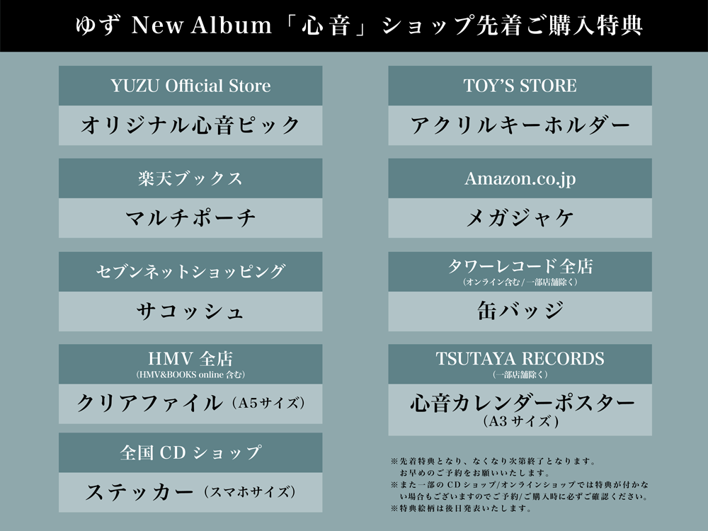 NEW ALBUM『心音』は、本日より各店舗にて予約受付がスタート。各店舗限定の予約特典も公開されました。